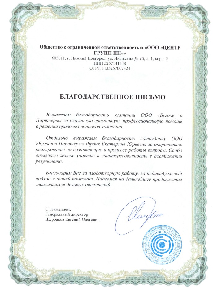 Благодарность юристам компании за профессионализм и оказание качественной юридической помощь
