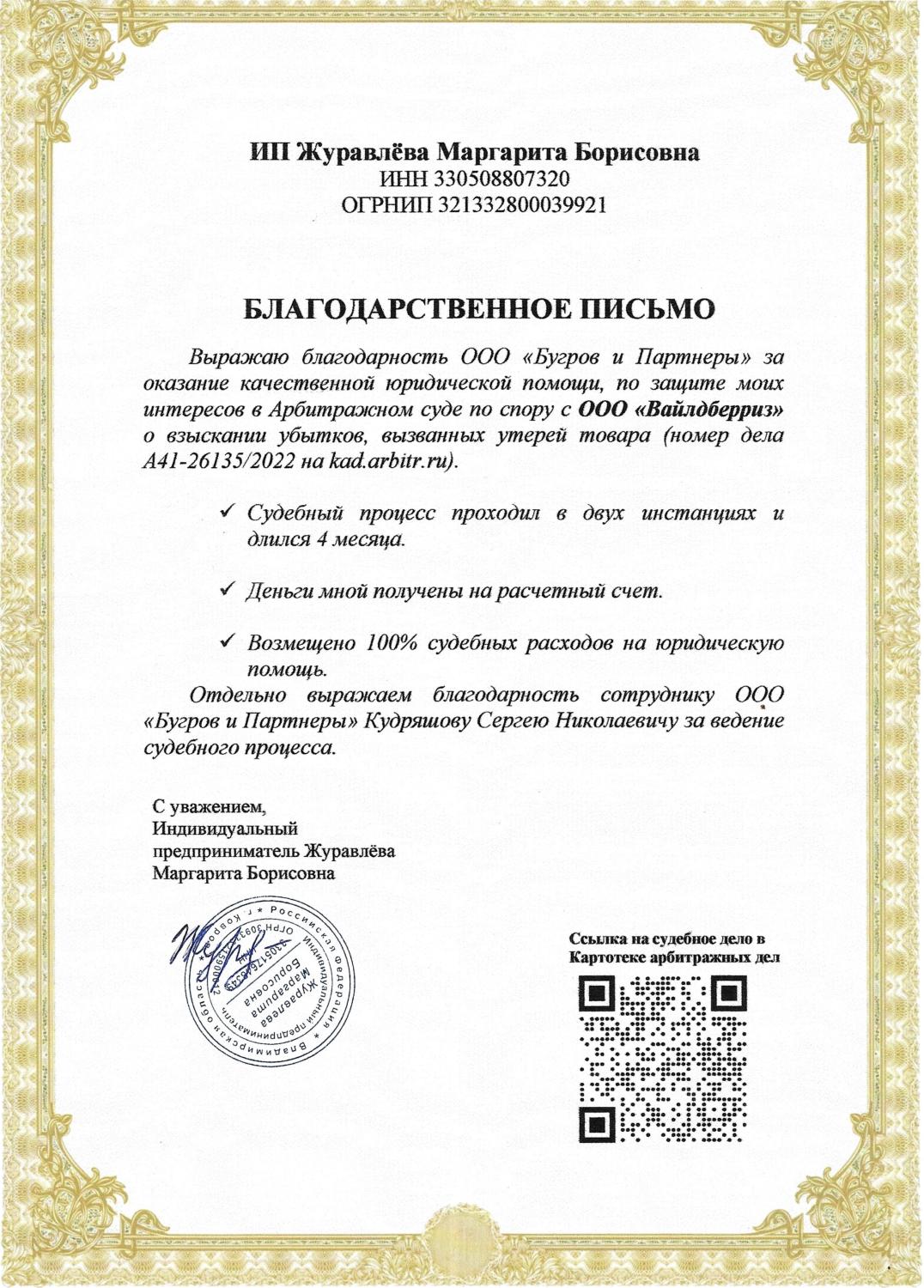 За оказание качественной юридической помощи по защите интересов в Арбитражном суде по спору о взыскании убытков с ООО "Вайлдберриз"